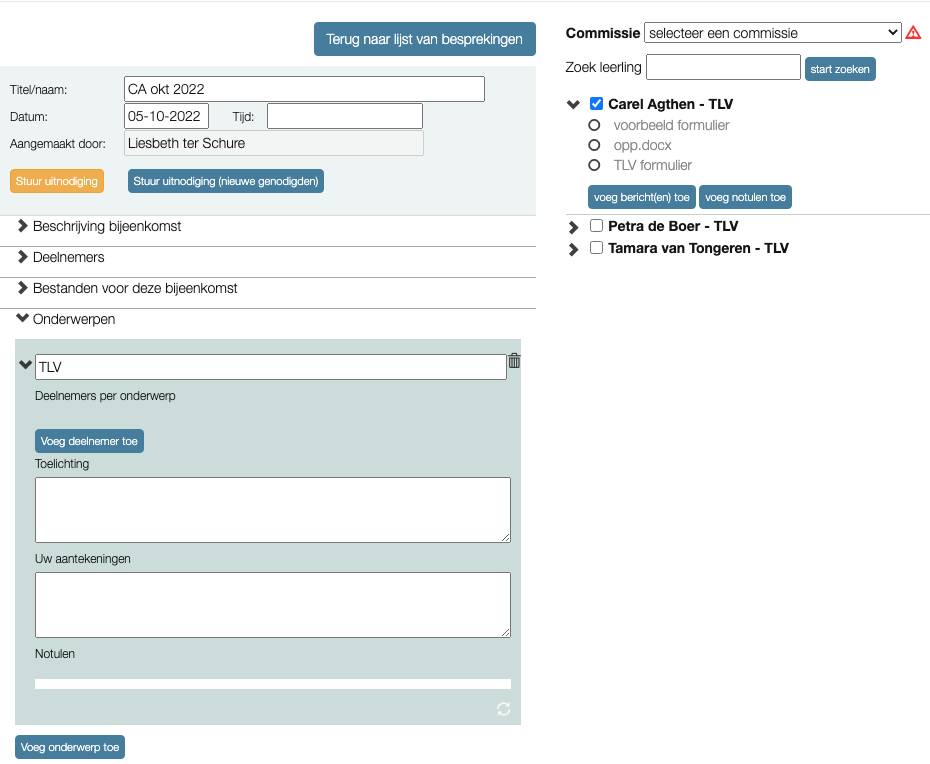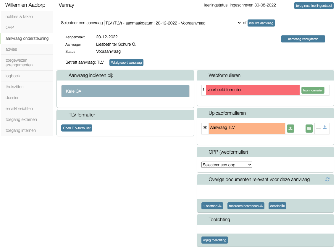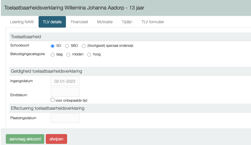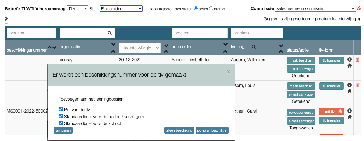 Als alle verplichte formulieren zijn ingevuld, wordt de aanmelding kenbaar gemaakt aan de leden van een besliscommissie (commissie aanmeldingen o.i.d.). Deze commissie neemt de beslissing om een leerling toe te wijzen aan een of meer arrangementen.|